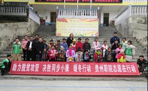 为全面落实习近平总书记关于脱贫攻坚和全面建成小康社会战略思想,贯彻落实党中央、国务院和省委、省政府关于打赢脱贫攻坚战的总体部署以及“大力开展扶贫志愿服务活动”的工作要求,2018年12月6日,贵州职业技术学院青年志愿者协会在我校团委的带领下,前往安顺市关岭县花江镇花嘎小学开展了以“助力脱贫攻坚,决胜同步小康,暖冬行动,贵州职院志愿在行动”为主题的志愿服务活动。