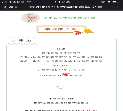 本次活动共25人中奖。首先,同学们通过微信关注我校团委微信订阅号“贵州职业技术学院青年之声”,在会话窗口回复“中秋快乐”即可抽奖。最后,校学生会于2018年9月21日18:00通过拨打电话的方式通知获奖同学前来大礼堂二楼领取奖品。