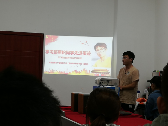 本次活动由校学生会的梁晓凯同学讲解邹勇松的精神,其中“世界以痛吻我,我要报之以歌”多次提到。梁晓凯同学更是多次提到,患有疾病的邹勇松同学,在于病魔做斗争的时候,已获得共享打印机、激光雷达自建实时电子地图等6项专利。梁晓凯同学说到:“优秀的邹勇松同学,是当代每一位青年大学生的榜样。”活动的最后,学生会主席江燕虎谈到:从学习邹勇松同学的精神中,我们在生活中,面对困难不卑不亢,在学习中,我们更是要像他那样奋斗学习,振兴中华,做一个对社会有用的人。广大学生干部更是积极发言到,“我们要宣扬邹勇松的精神,为实现中华民族伟大复兴奉献自己的聪明才智。”