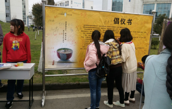 活动伊始,在院领导李皖校长、郭万才书记等校领导莅临现场,在校领导及各学院老师的带头签名下,我院学子积极响应号召,反对铺张浪费,从个人、从自己做起!