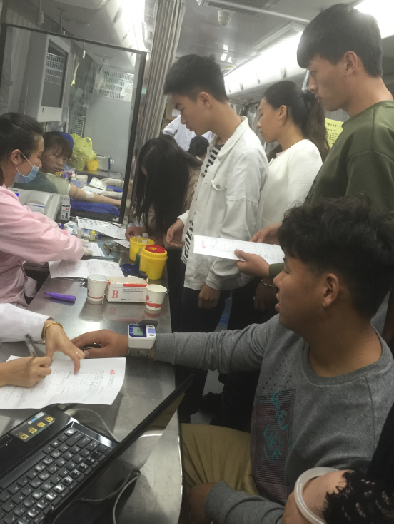 8号上午11点30时,随着献血车缓缓的开来,同学们纷纷加入到无偿献血的行列。在活动期间志愿者们详细的讲解怎样填献血表,认真负责的填写无偿献血证件。献血车上,同学们一个个鼓起勇气,互相鼓励。这次献血活动中,由于同学们的积极配合,短短的两天,我院就有134位同学参与了无偿献血活动,献血总量约为34600ml。