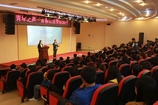 讲座开始前,主持人对团省委徐书记和学院郭书记进行了采访,就高校防艾宣传等问题进行了探讨。随后,由省疾控中心申莉梅老师、全省艾滋病预治专家姚永明从专业视角为同学们进行防艾讲座。讲座介绍了我国艾滋病的流行现状、艾滋病的危害、传播途经和我们如何正确对待身边的艾滋病患者等。讲座生动形象、通俗易懂,让大家对艾滋病的流行趋势,预防措施有了更加全面和深刻的认识。活动尾声老师和同学们展开了问答环节,同学们都积极抢答。
