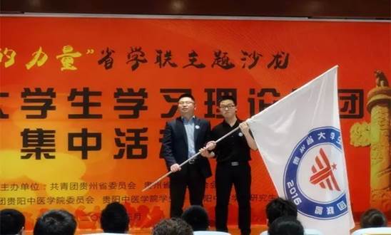 团省委副书记闵江涛老师为“贵州省大学生学习理论社团联盟”授旗。