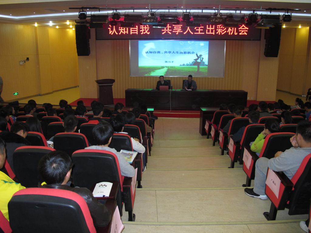 为提高学生干部综合素质,更好的服务同学。2013年10月24日,院团委邀请学院党委委员、纪委书记郭万才在图书馆报告厅为全院专职团干、优秀学生干部代表做《认知自我,共享人生出彩机会》学生干部培训专题讲座。团委学生会、社团联合会、各系学生会代表近200人参加了讲座。院团委王永峰老师主持讲座。