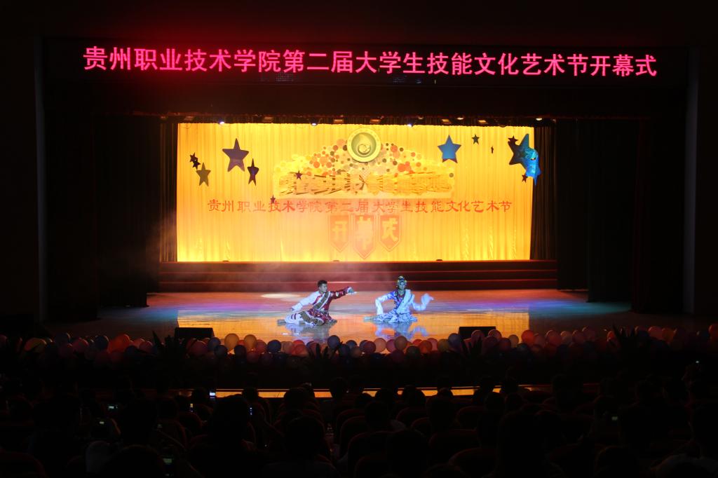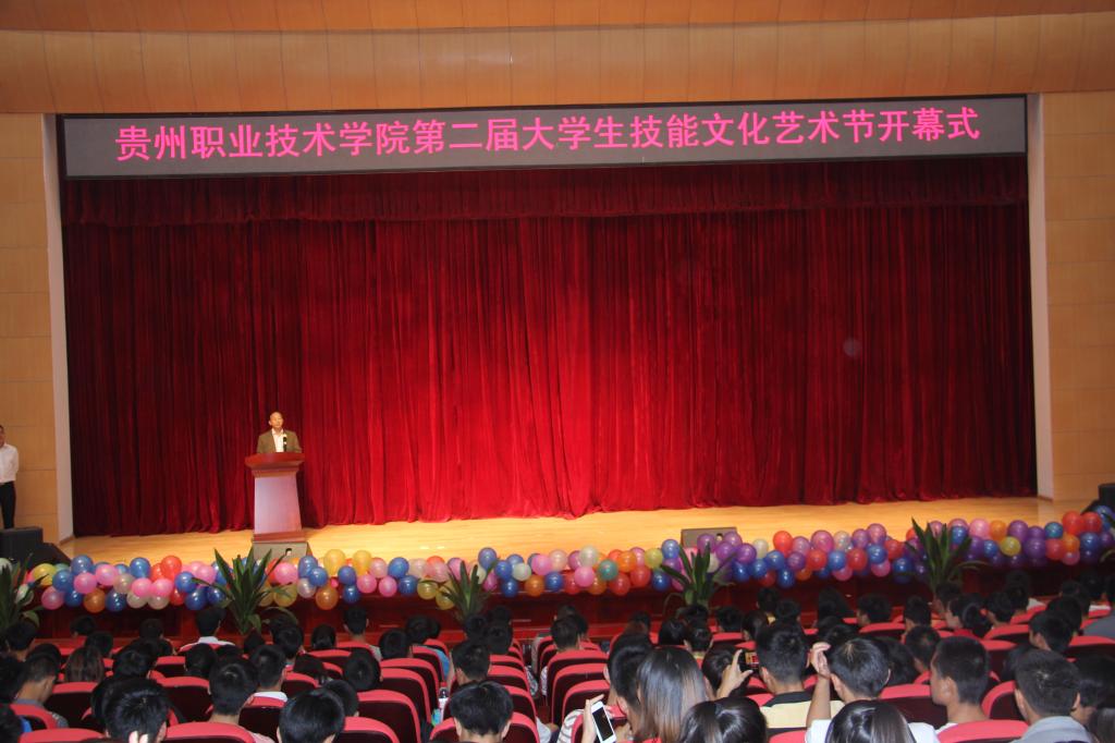 2013年10月14日晚七点,贵州职业技术学院第二届大学生技能文化艺术节开幕式在学院礼堂隆重举行。院党委委员、纪委书记郭万才、党委宣传部部长张仁俊、学生处处长于立群、信息系党总支书记梁正善、院团委副书记陈鹰、各系团总支书记、辅导员老师及学生代表1000余人参加了开幕式。开幕式由院团委副书记陈鹰主持。郭万才书记在开幕式上致辞,首先代表学院党委、行政向2600余名2013级新生表示慰问和欢迎。同时强调大学生技能文化艺术节是我院校园文化建设的重要组成部分;是同学们展现才华、张扬个性的舞台;是为广大同学掌握技能、成才立业的根基。