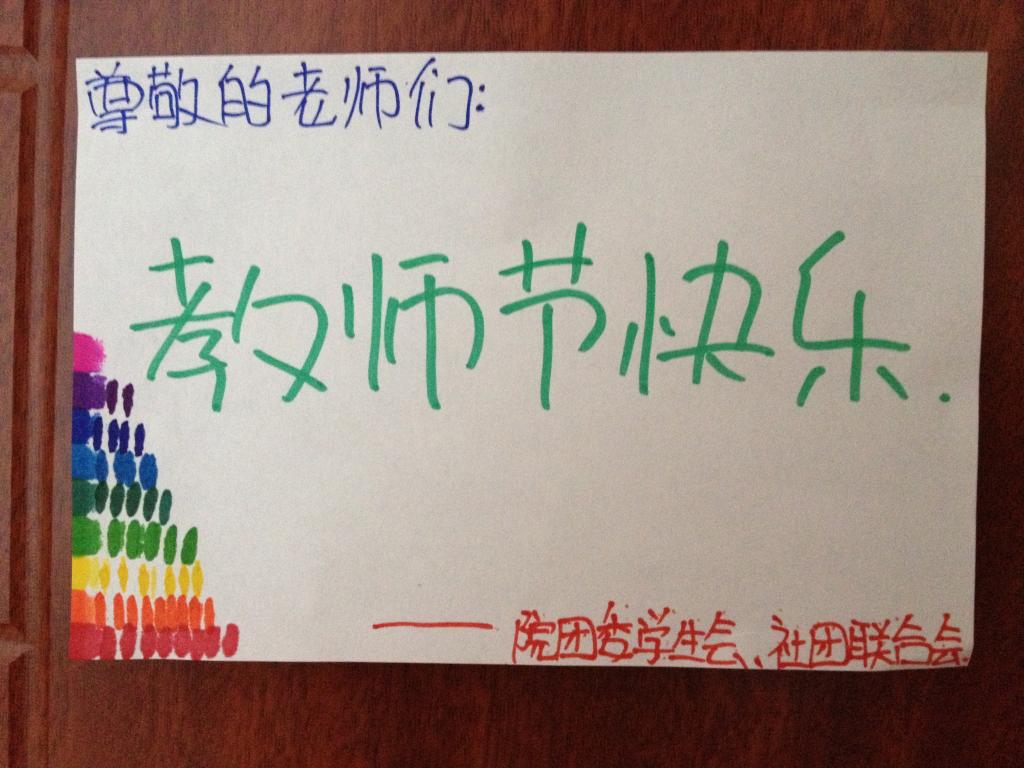 在这秋风送爽、丹桂飘香、充满喜庆和丰收的季节里,广大教育工作者又迎来了一年一度的教师节。2013年9月10日,我院团委学生会、社团联合会为老师们悄悄的送上了一份祝福。
