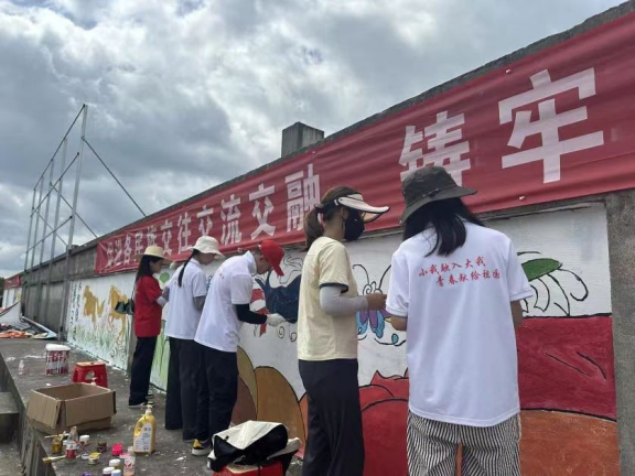同时,实践队绘画小组迎着烈日骄阳,走进赛马场,围绕“赛马”“马尾绣”“民族团结共进步”等主题开展墙绘工作。三幅墙绘作品美化了乡村环境,更成为中和镇赛马场上一道亮丽的风景线,得到当地干部群众的声声赞许。