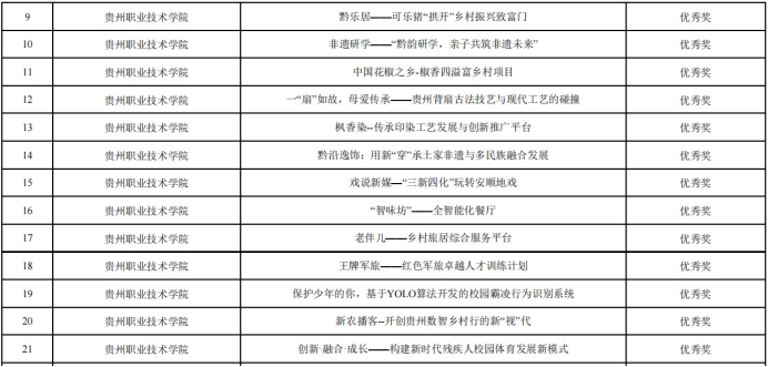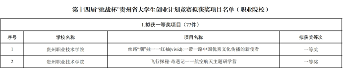 近日,第十四届“挑战杯”贵州省大学生创业计划竞赛在贵阳人文科技学院圆满落幕。根据组委会对省赛拟获奖项目公示,我校共有53项作品拟获省赛奖项,其中一等奖2项,二等奖8项,三等奖22项,优秀奖21项。