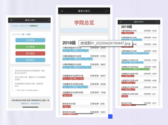 不知道大家发现没有,信息工程学院团总支从上周的第五名一下飙升到了第三名!为此,小青特地请教了信息工程学院团总支的冉老师,原来这些——是信息工程学院团总支青年团员网络192班团支部的冯光浩同学运用所学专业知识,自写代码,编写小程序,通过多次修改代码数量由1500行压缩至1000行,经历8次测试后,正式覆盖整个信息工程学院团总支。