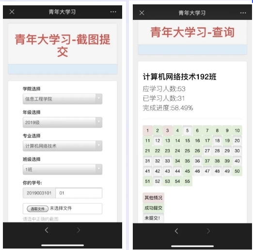 通过此小程序,同学们可以自行上传“青年大学习-网上主题团课”学习截图,团支书可一键查询后台尚未提交截图打卡的同学,并可以一键打包下载班级团支部截图,同时还可纵览不整个团总支的学习的情况。大大提升此项工作效率,并形成了比学赶超的优良态势。