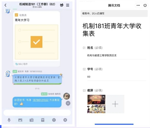 还有还有。还有我们机电与能源工程学院团总支机制181班团支部,他们采用qq收集表,同学们可以点击进入后填写姓名、学号、学习记录截图,团支书可以看到实时提交学习的人数,也可从后台导出成Excel表格,查看具体信息。这样一方面通过学号和姓名记录,可以看到完成情况,进而督促班级同学学习,一方面也利于团支书进行学习记录整理,减轻工作负担。
