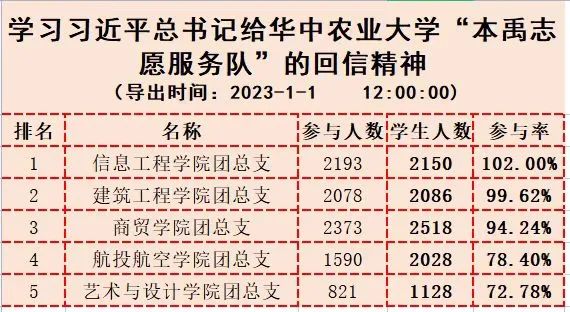 在此次学习中,信息工程学院、建筑工程学院、商贸学院、参学率位列各学院前三,其中信息工程学院稳居第一,希望信息工程学院继续保持,也希望艺术与设计学院继续努力。