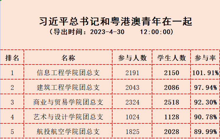 在此次学习中,信息工程学院、建筑工程学院、商业与贸易学院、参学率位列各学院前三,其中信息工程学院稳居第一,希望信息工程学院继续保持,也希望航投航空学院继续努力。