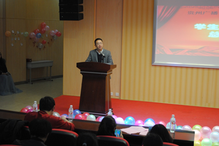 党委学工部、团委书记陈鹰讲话,陈鹰老师在肯定了各大学生组织2016年的工作成绩后,跟同学们分享了几点对于学生工作的思考,提出了“4321”的工作思路:“四有”是有平台、有事做、有成就、有收获,“三放”是放心、放手、放权,“两个保障”是有经费和制度保障,“一个目标”是服务师生、锻炼自己。