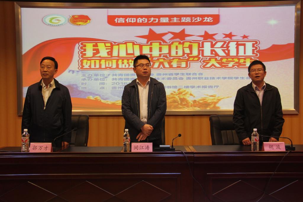 2016年10月28日,在十八届六中全会胜利召开、纪念红军长征80周年之际,由贵州团省委、贵州省学生联合会举办,我校团委承办的全省第九期“信仰的力量”省学联主题沙龙活动在我校隆重举行,团省委副书记闵江涛,贵州职业技术学院党委副书记郭万才,团省委学校部部长胡波,各省属高校团委书记出席活动,各省属高校学生会(研究生会、社团联合会)主席团成员、贵阳地区学生会(社团联合会)主席团等70余名学生代表参加活动。活动开始前,我校党委书记邓惠宾老师会见了团省委副书记闵江涛一行,并对团省委长期以来对我校共青团工作的关心和支持表示感谢。