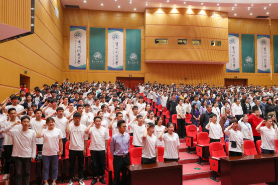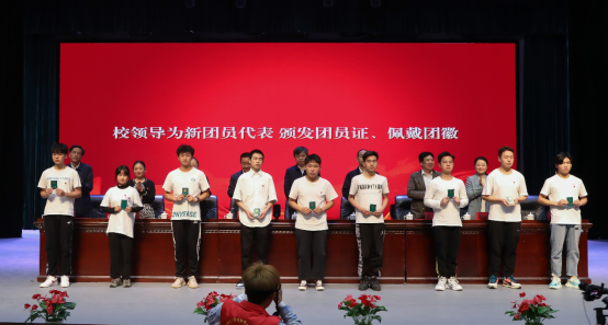 上午9时,大会在庄严的国歌声中正式开始。校领导为2021年新入团团员代表颁发团员证、佩戴团徽。团委副书记李雪芬带领新团员宣誓、老团员重温入团誓词。