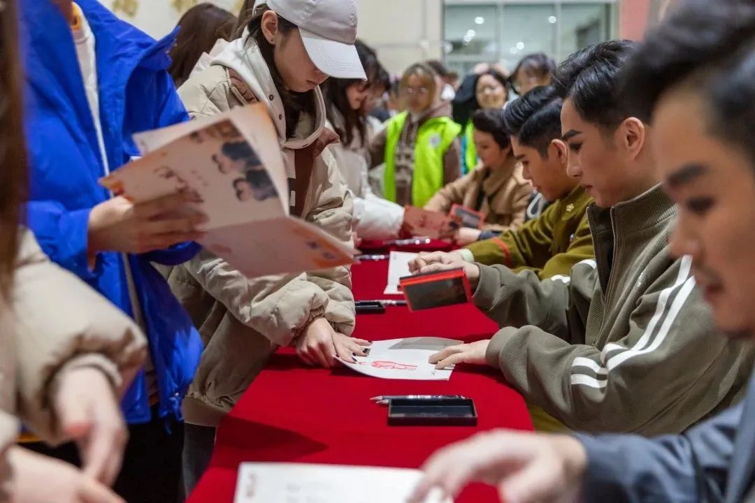 演出结束后,浙江小百花越剧院全体演职人员在大礼堂前厅举办小型见面会,同学们纷纷同艺术家们合影留念。