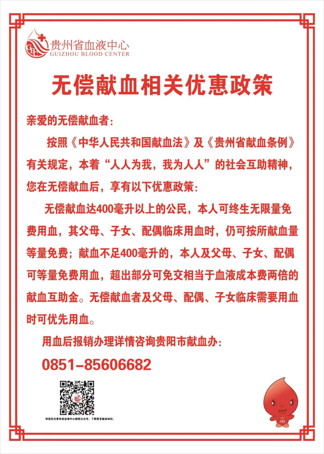 根据《中华人民共和国献血法》及《贵州省献血条例》有关规定,本着“人人为我,我为人人”的社会主义互助精神,您在无偿献血后,享有以下优惠政策: