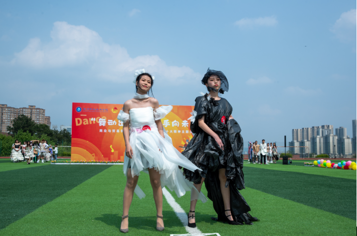 班级环保服装秀——焕发青春创意,引领创新之智。在环保服装秀环节,2022级各班现场展示个性鲜明、设计新颖的环保服装40余套。他们以“生态贵州 环保我先行”为主题,凝聚班级智慧,结合创新创意,用废报纸、快递箱、泡沫纸等材料制作能够代表班级特色的环保服装。负责服装展示的同学身着班级希望,脚下意气风发,展现出新时代青年自信自强、勇毅前行的昂扬姿态。