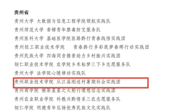 近日,共青团中央发布《2023年全国大中专学生志愿者暑期文化科技卫生“三下乡”社会实践活动总结通报结果公示》,贵州职业技术学院“从江县刚边村暑期社会实践团”喜获全国“三下乡”优秀团队。